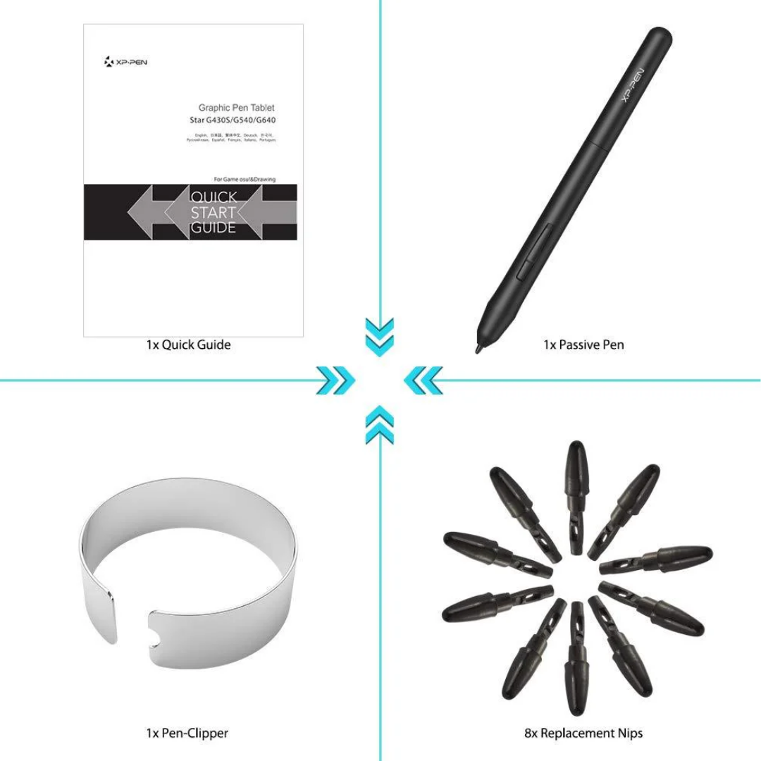 [Complete Bundle]: Standard package contents include a Pen Tablet, P01 Passive Pen, USB cable, Pen Clipper, a Quick Guide, and 20 Pen Nibs. Free driver is also available for download.